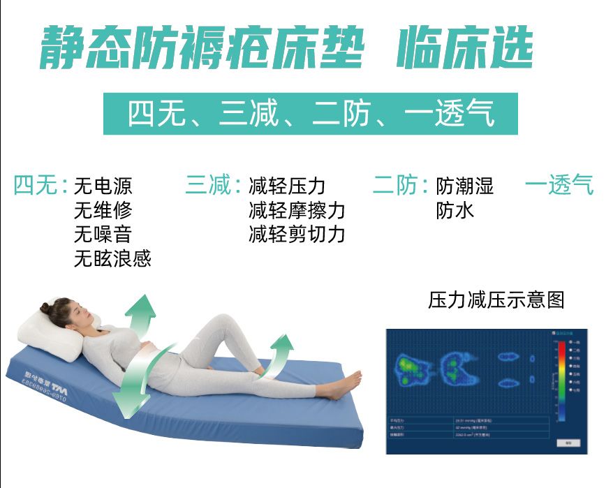 静态防褥疮床垫是蒙泰护理所研发生产的一款适用于预防褥疮的护理类床垫,其中蒙泰护理曾打出静态防褥疮床垫的4无3减2防1透的特点,这几个特点到底是什么意思呢?