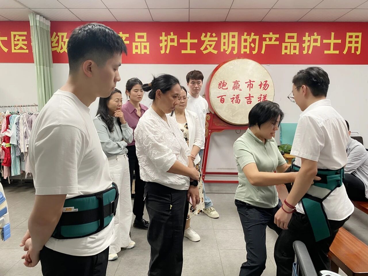 香港大学深圳医院心内科护长黄芳梅对蒙泰转化广东省第二人民医院护士创新的“灯笼约束手套”和蒙泰自主研发的“移位带”表现出浓厚兴趣,并现场亲身体验。她在认可产品实用性的同时,也基于丰富的临床经验提出了宝贵的优化建议。