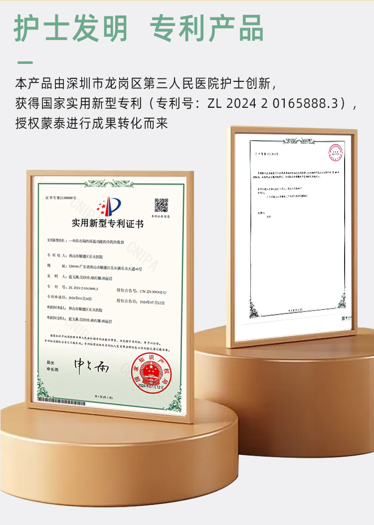 医用隔热保温中药热敷袋由深圳市龙岗区第三人民医院护士创新获得国家实用新型专利(专利号:ZL202420165888.3)授权蒙泰进行成果转化而来